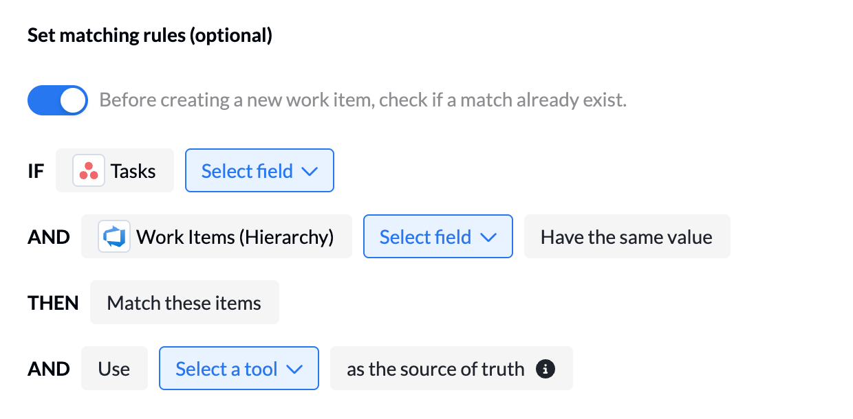 This is useful when multiple tools contain records representing the same work, customer, asset, or entity. Matching prevents parallel versions of the same item and keeps systems aligned.