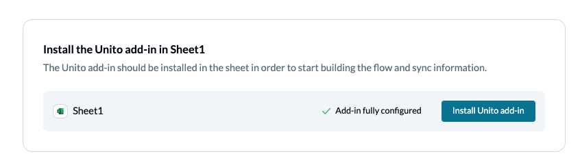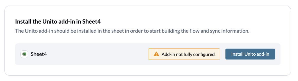 By clicking on Verify add-in status, Unito will automatically check to ensure the add-in for Excel is installed and properly configured. If it's not, you'll see this: