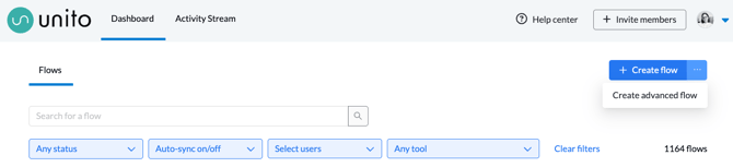 1. Sign in to app.unito.io and click +Create advanced flow from the Unito dashboard.If you don't have any flows already created, you'll automatically be brought to the flow builder screen instead of the Unito dashboard.