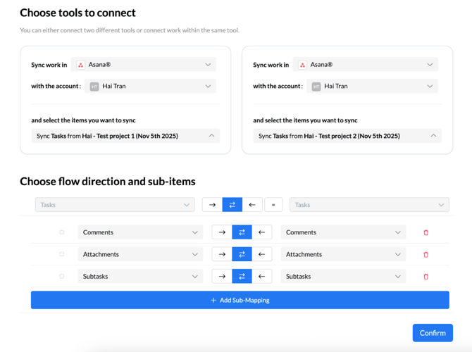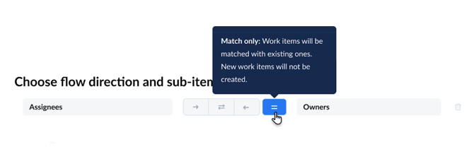 For each item and sub-item, you’ll also decide how information should move between your tools — whether updates should flow one way, both ways, or only between existing matched records.