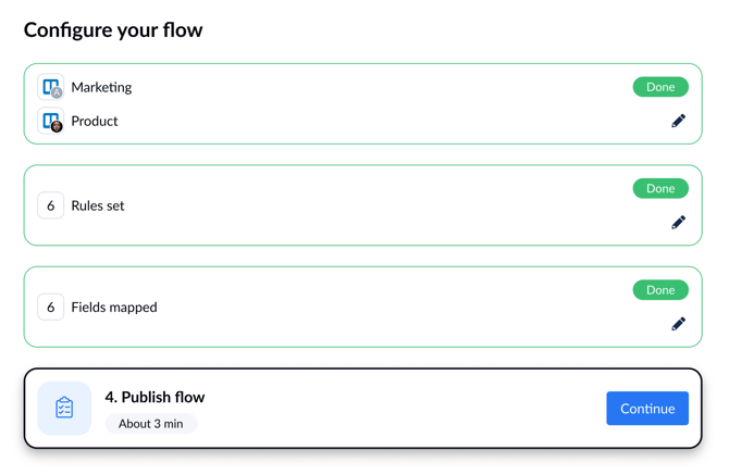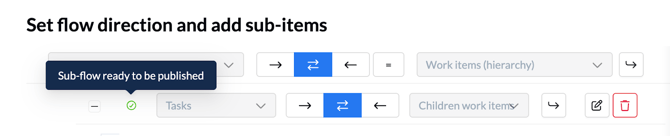 Don’t hit “Publish flow” just yet. You’ll publish this sub-flow along with its parent flow (and any other nested sub-flows when launching your parent flow. - Navigate back to your parent flow tab: Once you have reviewed the settings, the level will be marked with a green checkmark, indicating it is ready to sync.