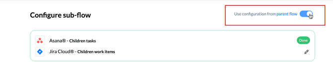 Field mappings and default values are automatically carried over from parent flows to sub-flows to save you time. You can however click on the pencil icon to configure your sub-flow and override this configuration if you so choose by deactivating this toggle: