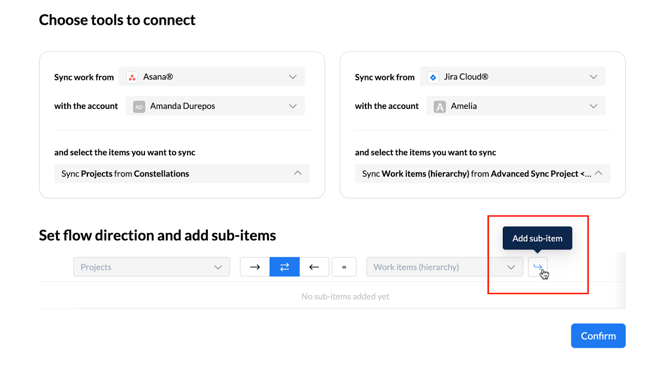 - Add sub-mappings: Click Add sub-item and choose the next level you want to sync in your hierarchy, such as Tasks syncing to Stories.