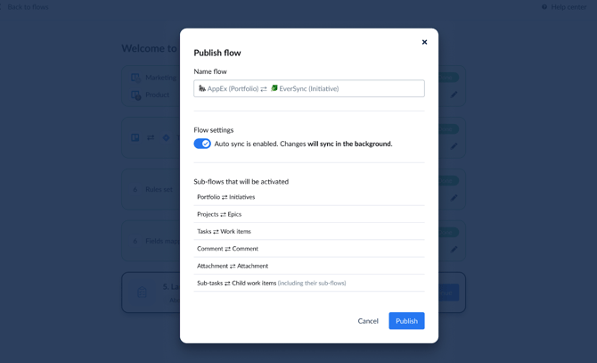 In this structure, each level of the hierarchy consists of different work item types—for instance, mapping Asana Portfolios and Projects to Jira Initiatives and Epics. Because these different item types do not share the same fields, Unito creates draft sub-flows for you to manually review and approve, ensuring your data is mapped accurately across planning and execution layers